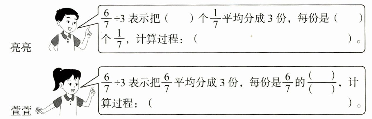 1. 亮亮和萱萱在研究如何计算$\frac{6}{7}÷ 3$,请你根据他们的想法填一填。