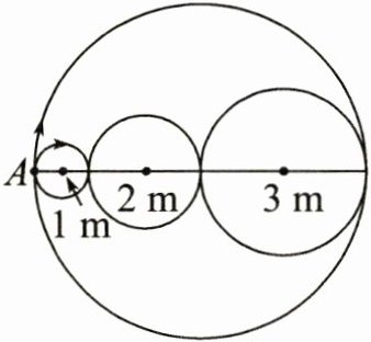 3. 如图,小华从点A出发沿大圆走一周回到点A,小英从点A出发沿所有小圆走一周回到点A。他们走的路程相等吗?你发现了什么?(图中数据均为小圆直径的长度)