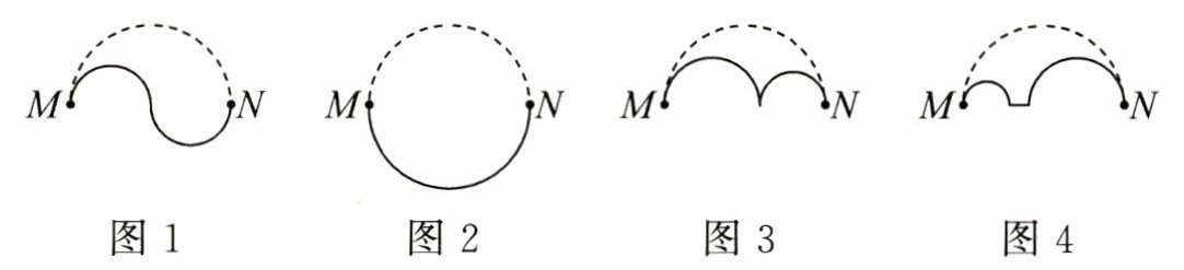 (2)两只蚂蚁沿不同的路线从点 $ M $ 爬到点 $ N $,甲蚂蚁沿虚线爬,乙蚂蚁沿实线爬(图中曲线部分由半圆构成)。下面四幅图中,两只蚂蚁爬的路线一样长的有(