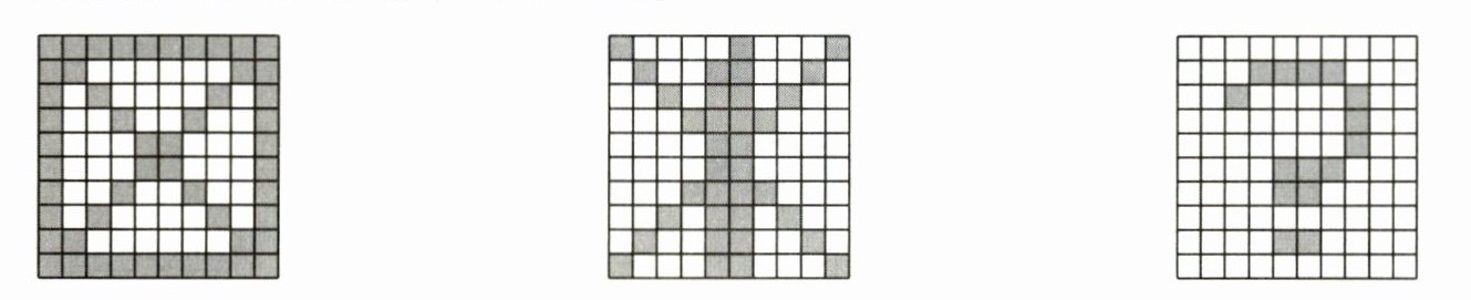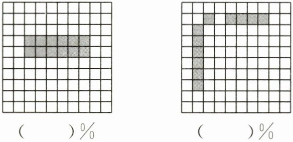 第一个图案:左上方一个由10个小方格组成的向右下的斜线图案(从正方形的左上角第一个格子开始,向右一格,再向下一格,依次循环直至画出10个格子的斜线),整体大致呈平行四边形,共涂10个小方格,整个大正方形是10×10的方格,共100个小方格,所以对应的百分数为10%。
