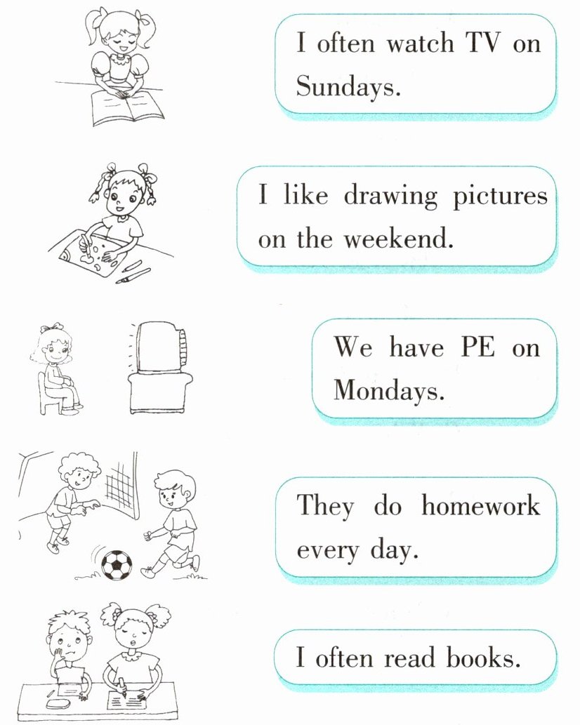 (连线顺序为:图1-I often read books.;图2-I like drawing pictures on the weekend.;图3-I often watch TV on Sundays.;图4-We have PE on Mondays.;图5-They do homework every day.)