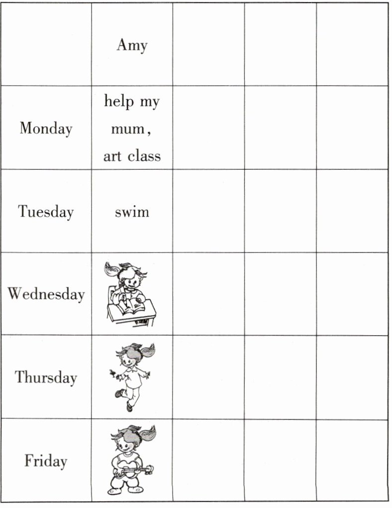 | Friday | play the piano, have an English class | go hiking | play games | buy some fruits |