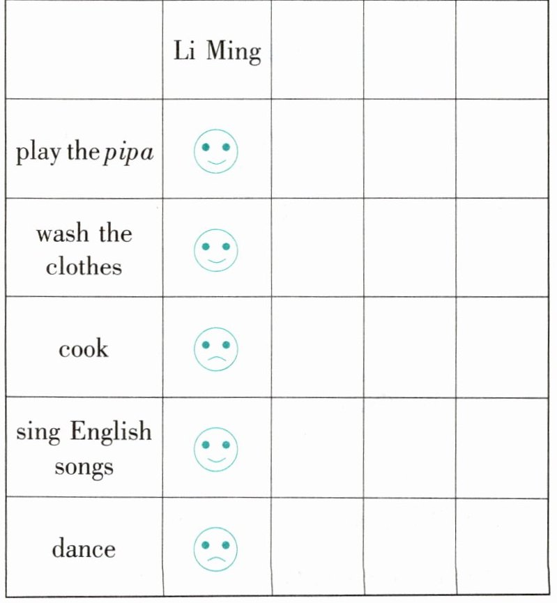 B: I can play the pipa. I can wash the clothes. I can sing English songs. But I can't cook. I can't dance.