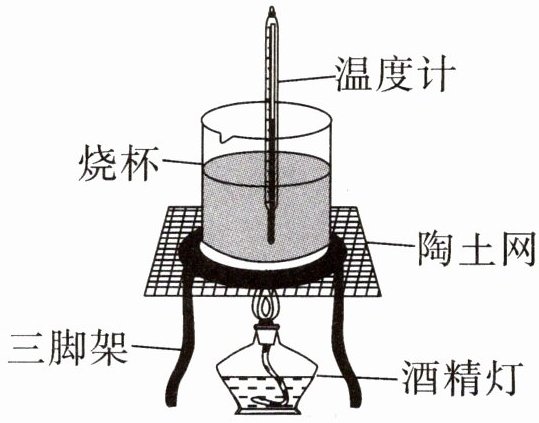实验材料:酒精灯、三脚架、陶土网、烧杯、温度计、秒表、常温水、铁架台等。
