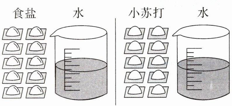 1. 如图,分别把 20 克食盐和小苏打平均分成 10 等份加入,主要是为了( )。