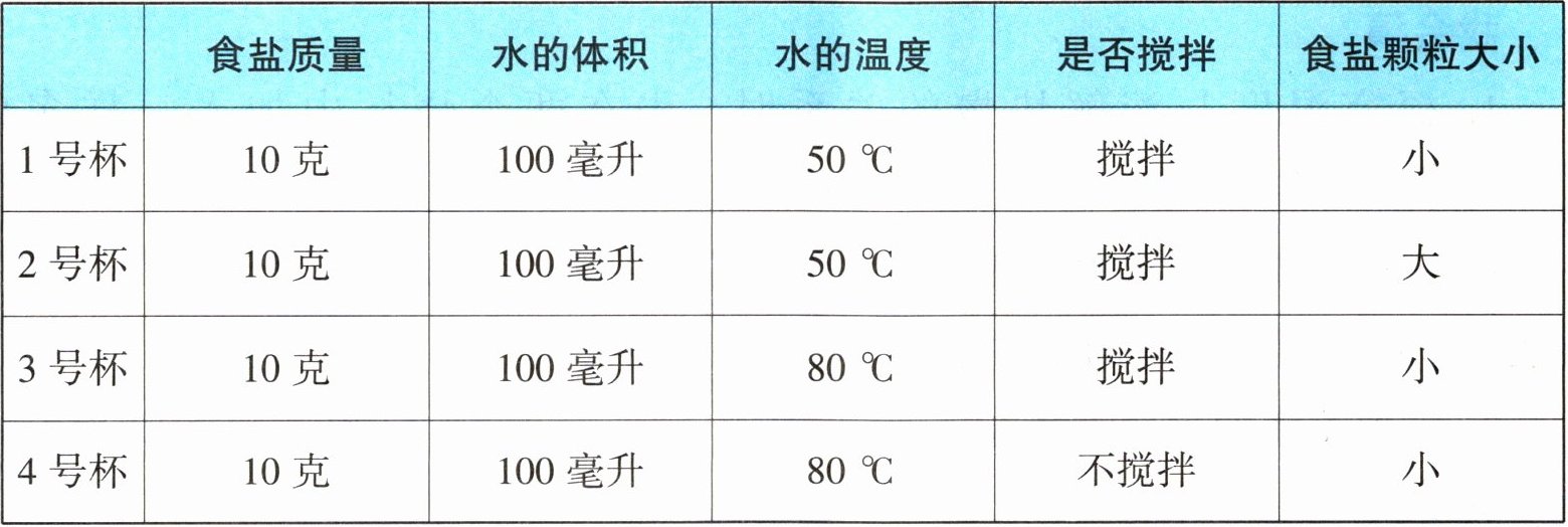 | | 食盐质量 | 水的体积 | 水的温度 | 是否搅拌 | 食盐颗粒大小 |