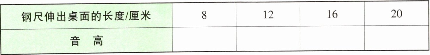 实验结论:钢尺伸出桌面越短,音高越高;钢尺伸出桌面越长,音高越低。