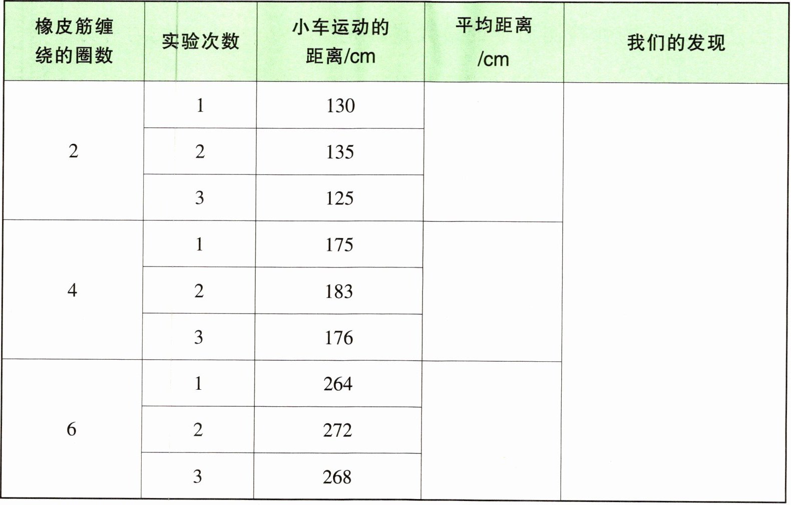 |橡皮筋缠绕的圈数|实验次数|小车运动的距离/cm|平均距离/cm|我们的发现|