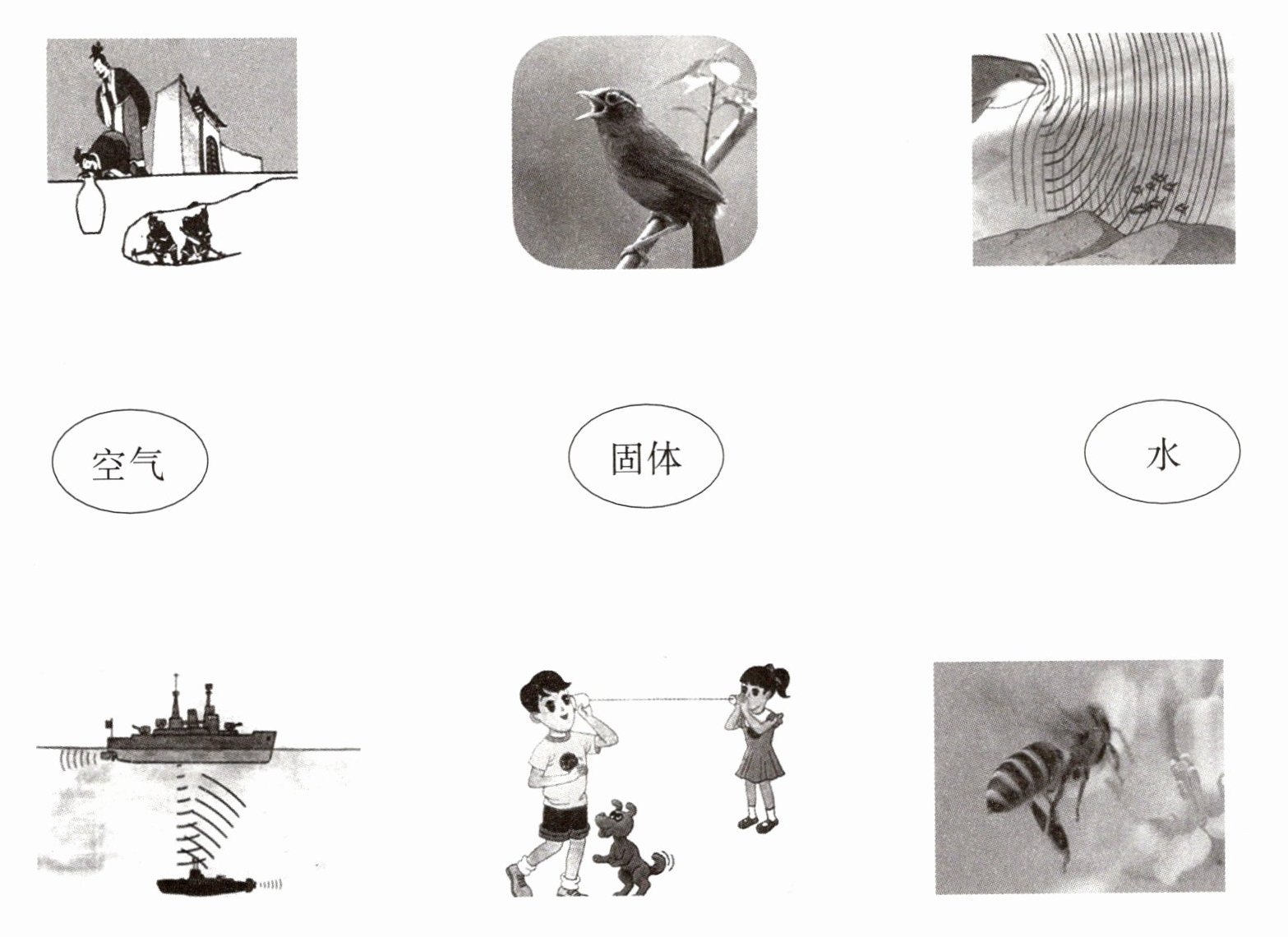 二、请将下列图片和其对应的声音传播介质连起来