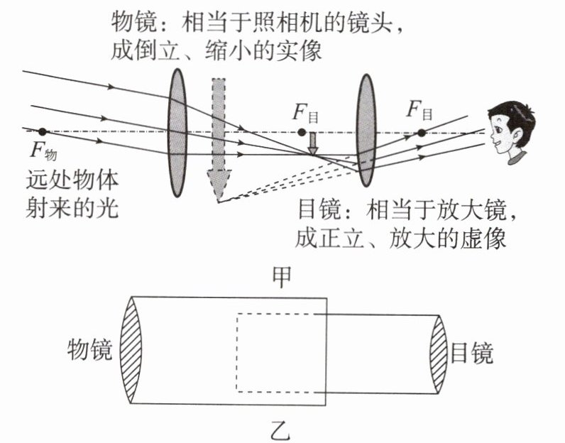 (1)如图甲所示,物镜的成像点到物镜的距离大于物镜的焦距、小于物镜的2倍焦距,且成像点到目镜的距离小于目镜的焦距。由于观察远近不同的物体时,像点在移动,需要调节两凸透镜间的距离,故镜筒要设计成两段,使其可调节,如图乙所示。