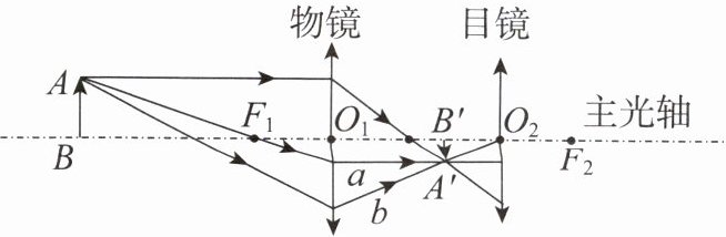 (3)画出光线$a$、$b$经目镜折射后的光路。