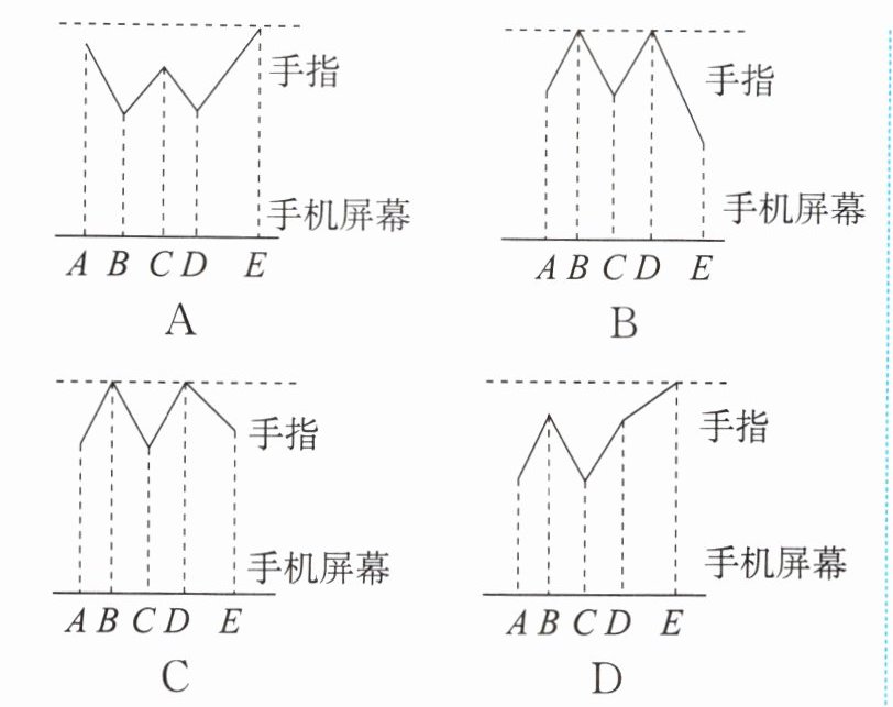 10. 有的手机内有超声波识别系统,手机发出超声波遇到手指上凸凹不平的指纹 A、B、C、D、E 五个位置,回收信号的时间分别为 0.27 ms、0.41 ms、0.27 ms、0.41 ms、0.19 ms。据此,可求出手指与手机屏幕间的距离,则该处指纹的大致形状是(