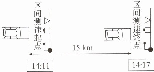 例1 如图所示,某小汽车经过一段长为15km的区间测速路段时,该路段两个监控分别记录了该车辆到达测速起点和测速终点的时刻。该小汽车通过该路段的时间为