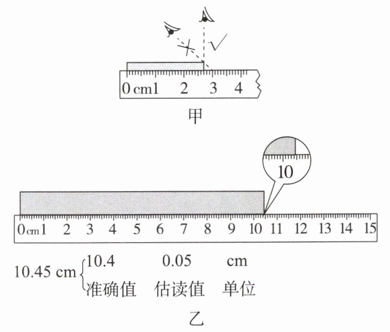 刻度线,如图甲所示。读出准确值,估读到分度值的下一位,如图乙所示。(5)记:记录时,要记录数值和测量单位。