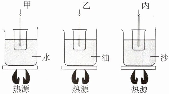 2. 某兴趣小组用相同的小烧杯盛等量的水,在标准大气压下,用相同的热源加热。如图所示,甲杯为隔水加热,乙杯为隔油加热,丙杯为隔沙加热,加热很长一段时间后,测小烧杯外物质的温度,结果分别为水温100${}° C$、油温200${}° C$、沙温600${}° C$,则三个小烧杯中水的温度高低关系为(