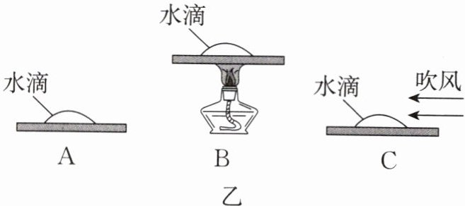 的方式来加快液体蒸发的。小明想探究影响水蒸发快慢的其他因素,他在三块完全相同的玻璃板上各滴一滴等量的水,如图乙所示,通过A、B两图可探究水蒸发快慢与水的温度