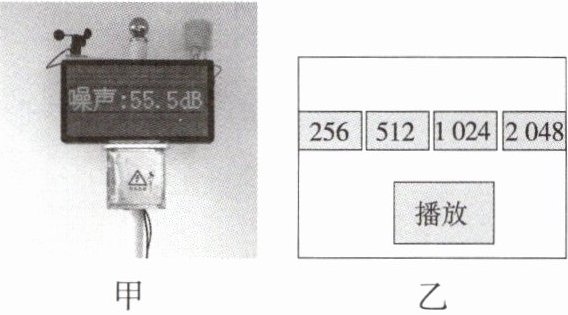 4. 生活中的两个情境如图所示,图甲是居民小区噪声监测器示意图,表示当时的环境噪声为55.5dB。图乙是用手机上的一个调音软件播放256Hz、512Hz、1024Hz、2048Hz的标准音的示意图。下列说法正确的是(