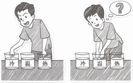 如图所示,把两只手指分别放入热水和冷水中。过一会儿,再把这两只手指同时放入温水中。