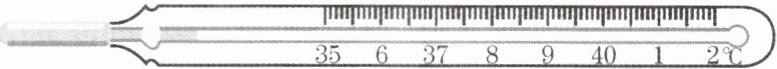 如图所示,玻璃体温计目前仍广泛用于医疗领域,家庭中也常用它来测量体温。测量时只要将玻璃泡与人体充分接触,一般5~10 min后取出读数,即可知道体温。你会使用体温计测量自己的体温吗? 尝试用你家中的体温计测量自己的体温。
