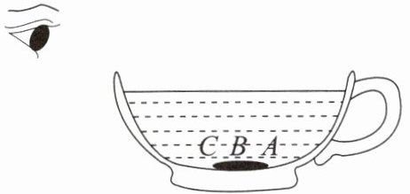 12. 如图所示,在观看水中的硬币的活动中,把一枚硬币固定在空杯的底部,找一个角度使你刚好看不到硬币的最右端$A$点。保持眼睛和杯子的位置不变,在同学逐渐把水加入到杯中的过程中,硬币上的$B点和C$点能先后被看到。