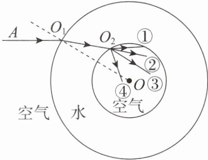 9. 在天宫课堂中,航天员将空气注入水球,形成的气泡球与水球的球心都在$O$点。一束光从空气射入水球的光路如图所示,其中球心$O与入射点O_{1}$的连线为法线,则进入气泡球的折射光线可能为(