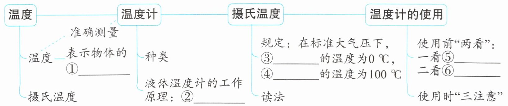①冷热程度 ②液体热胀冷缩的规律 ③冰水混合物 ④沸水 ⑤测量范围 ⑥分度值