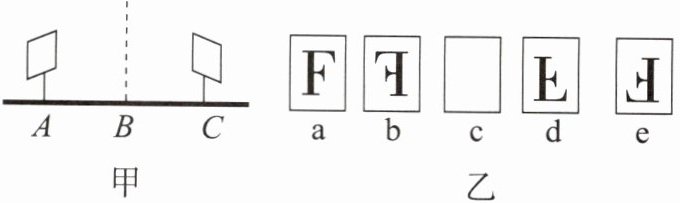 3.(安徽中考)某小组探究平面镜和凸透镜成像的特点,将光源和光屏分别竖直放置在水平光具座上的 $ A $、$ C $ 位置,$ B $ 是 $ AC $ 的中点,如图甲所示。在 $ AB $ 之间朝向 $ A $ 观察,看到的光源形状如图乙中的 $ a $ 所示。