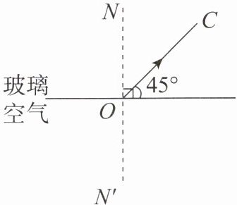 例 2 (德阳中考)光从玻璃斜射入空气中,在玻璃与空气的交界面上发生折射和反射,反射光线 $ OC $ 如图所示,请在图中画出入射光线 $ AO $ 和折射光线 $ OB $ 的大致方向。