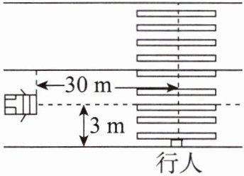 11. 研究发现,人在饮酒后驾车的反应时间是未饮酒时的2~3倍。反应时间是指司机从看到意外情况到踩刹车的这段时间;在反应时间内汽车保持原来的速度前进一段距离,这段距离叫反应距离。如图所示,某人酒后驾车沿马路直线行驶,车头中央距马路边缘3m,车在到达某位置时,司机发现一人正从路边出发闯红灯通过人行横道,此时汽车的速度为15m/s,距离人的行走路线为30m,已知该司机的反应时间为1.2s,刹车后汽车不能立即停下来,再经过1s刚好行驶到人的行走路线。