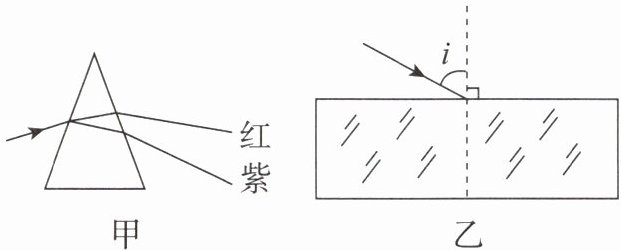 例2 甲图是一束太阳光通过三棱镜后发生色散的示意图,乙图中一细束红光和一细束紫光以相同的入射角$i$从空气射入长方体玻璃砖的同一点,并且都直接从下表面射出。对于这一过程,有下列四种说法: