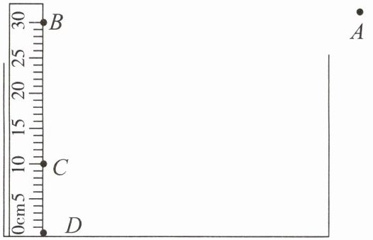 13. (潍坊中考)为测量容器中水的深度,一同学将刻度尺竖直插入水中,如图所示。从$A$处向水中看去,看到刻度尺上$B点在水中所成的像位于C$点,同时看到水中$D点的像也位于C$点。请据此: