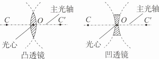(2)光心:是主光轴上特殊的点,通过光心的光传播方向不变。如图所示。
