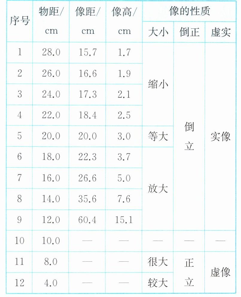 (2)移动的过程中,选取若干个位置,并调整光屏位置使物体在光屏上成清晰的像,把每次观察到的物距,以及像的虚实、大小、正倒等情况都记录在表格中。