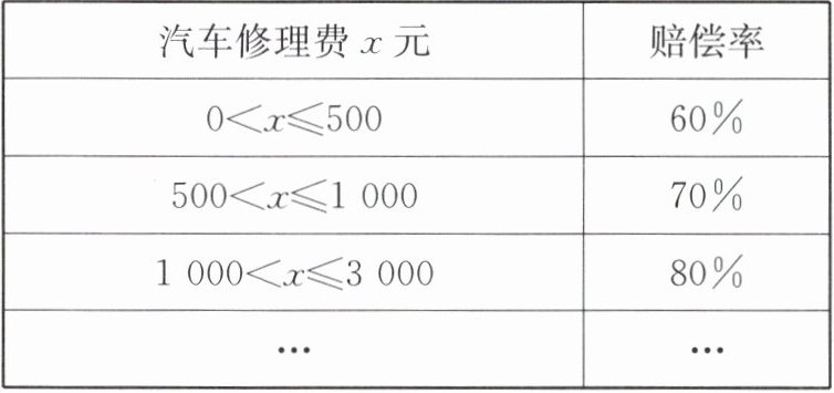 1. 某保险公司的汽车保险,对于汽车修理费按分段赔偿的方式进行赔偿,具体赔偿细则如下表. 某人的汽车修理后,其在保险公司得到的赔偿金额是2000元,那么此人的汽车修理费是______元.