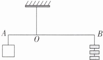 1. 在数学活动课上,某兴趣小组的同学用一根质地均匀的轻质木杆和若干个钩码做试验.如图,在轻质木杆O处用一根细线悬挂,左端A处挂一重物,右端B处挂钩码,每个钩码质量是50 g.若$OA= 20\ cm$,$OB= 40\ cm$,挂3个钩码可使轻质木杆左右平衡.设重物的质量为$x\ g$,根据题意列方程得(