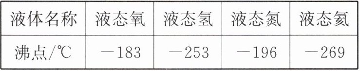 ). | 液体名称 | 液态氧 | 液态氢 | 液态氮 | 液态氦 |