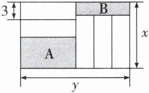 12. 如图,长为$y$,宽为$x$的大长方形被分割为7块小长方形,除阴影小长方形A,B外,其余5块是形状、大小完全相同的小长方形,其较短的边长为3. 下列结论: