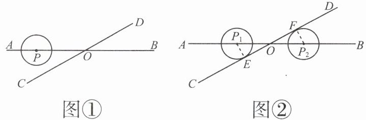 解:如图②,当$\odot P运动到\odot P_1与点C$相切时,可得$P_1E \perp CD$. 又$\angle AOC = 30^{\circ}$,$\therefore OP_1 = 2P_1E = 2 × 1 = 2(cm)$. $\therefore \odot P运动到\odot P_1所用的时间t_1 = \frac{6 - 2}{1} = 4(s)$.