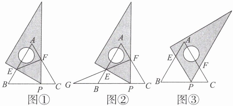 (1) 如图①(见下页),当P为BC的三等分点且$PE \perp AB$时,判断$\triangle EPF$的形状。