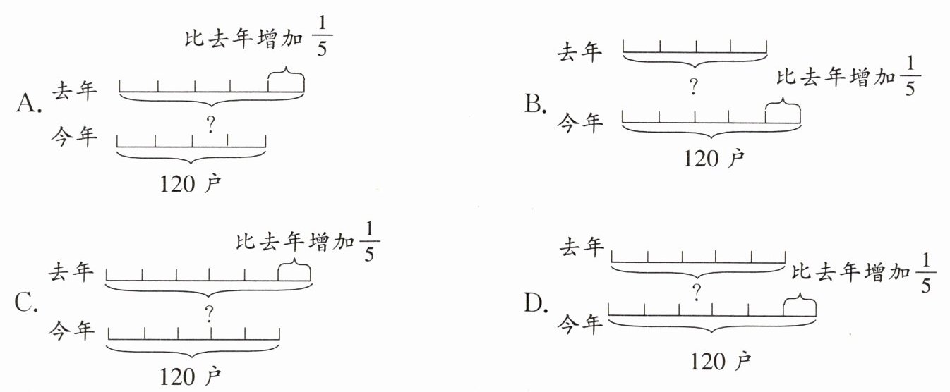 8. 西湖小区今年拥有小汽车的家庭有120户,比去年增加了$\frac{1}{5}$,西湖小区去年拥有小汽车的家庭有多少户?下面几幅线段图表示正确的是( )。