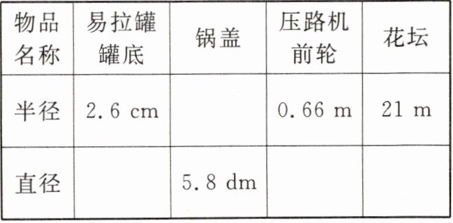 半径:2.6 cm、2.9 dm、0.66 m、21 m;直径:5.2 cm、5.8 dm、1.32 m、42 m