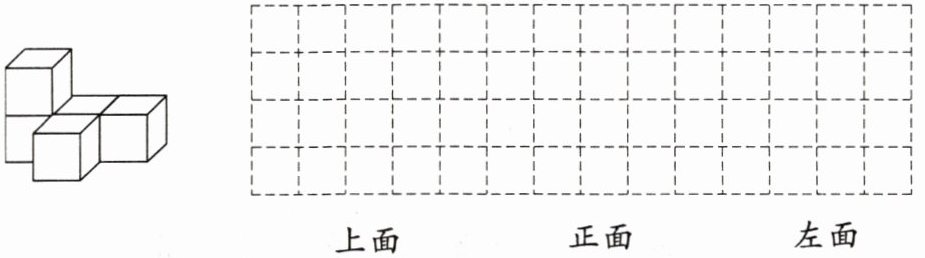 10. 妙妙和妹妹正在玩搭积木游戏,她们利用小正方体搭建出漂亮的造型。你知道妙妙和妹妹一共用了多少个小正方体搭成这个立体图形吗?如图所示,我们可以从不同方向观察这个立体图形,请你分别画出从上面、正面及左面看到的形状。