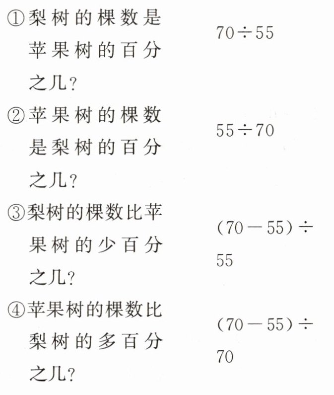 ①梨树的棵数是苹果树的百分之几? 55÷70;②苹果树的棵数是梨树的百分之几? 70÷55;③梨树的棵数比苹果树的少百分之几? (70 - 55)÷70;④苹果树的棵数比梨树的多百分之几? (70 - 55)÷55