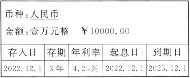 5. 下面是龙老师将$10000$元存入某银行后拿到的存单上的部分信息,到期后龙老师可获得利息多少元?