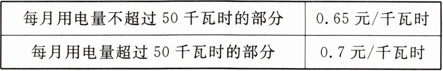(2)50×0.65 = 32.5(元)(64 - 32.5)÷0.7 = 45(千瓦时)50 + 45 = 95(千瓦时)答:小李家10月份用电量是95千瓦时。