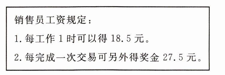 11. 大学生小军利用暑假勤工俭学,去某公司做了一个星期的销售员。下面是该公司销售员的工资规定,小军一个星期共收入886元,其中完成了8次交易,他这个星期工作了多少时?