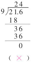 $\begin{array}{r}24\\ 9\overline{)21.6}\\ 18\\ \hline 36\\ 36\\ \hline 0\end{array} $