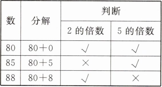 你能用上面的方法快速地判断出下面各数中哪些是 2 和 5 的倍数吗?是的画“√”。你还能得到什么结论?
