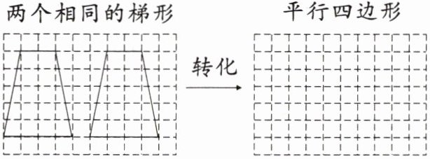 两个相同的梯形转化为平行四边形,平行四边形的高相当于一个梯形的(高),平行四边形的底相当于一个梯形的(上底加下底的和),一个梯形的面积是转化后平行四边形面积的(一半)。因为平行四边形的面积=(底×高),所以梯形的面积等于((上底+下底)×高÷2),用字母表示:(S=(a+b)h÷2)。