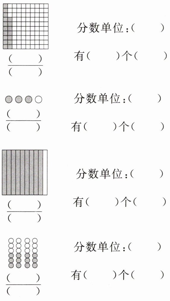 (3) 把 20 颗糖平均分成 5 份,其中 4 份用分数表示是( ),它的分数单位是( ),它有( )个这样的分数单位。